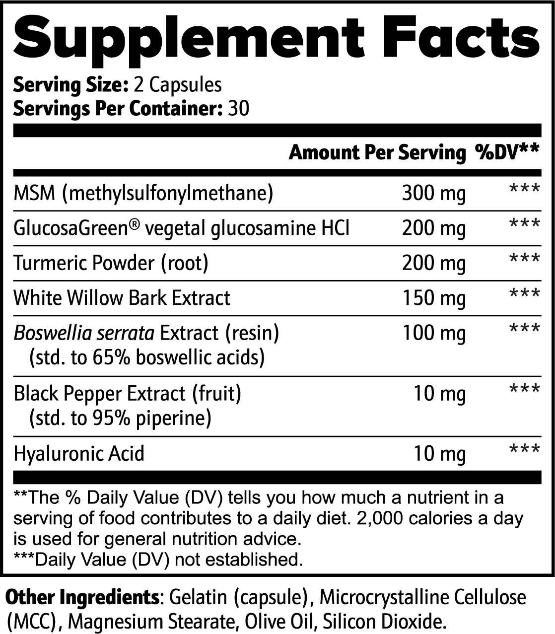 Suggested use: As a dietary supplement, adults take two (2) capsules daily. For best results, take with 6-8 oz of water or as directed by healthcare professional.